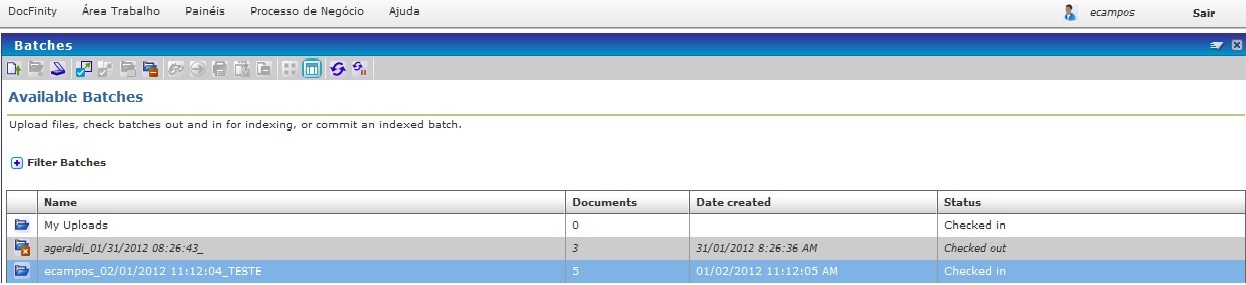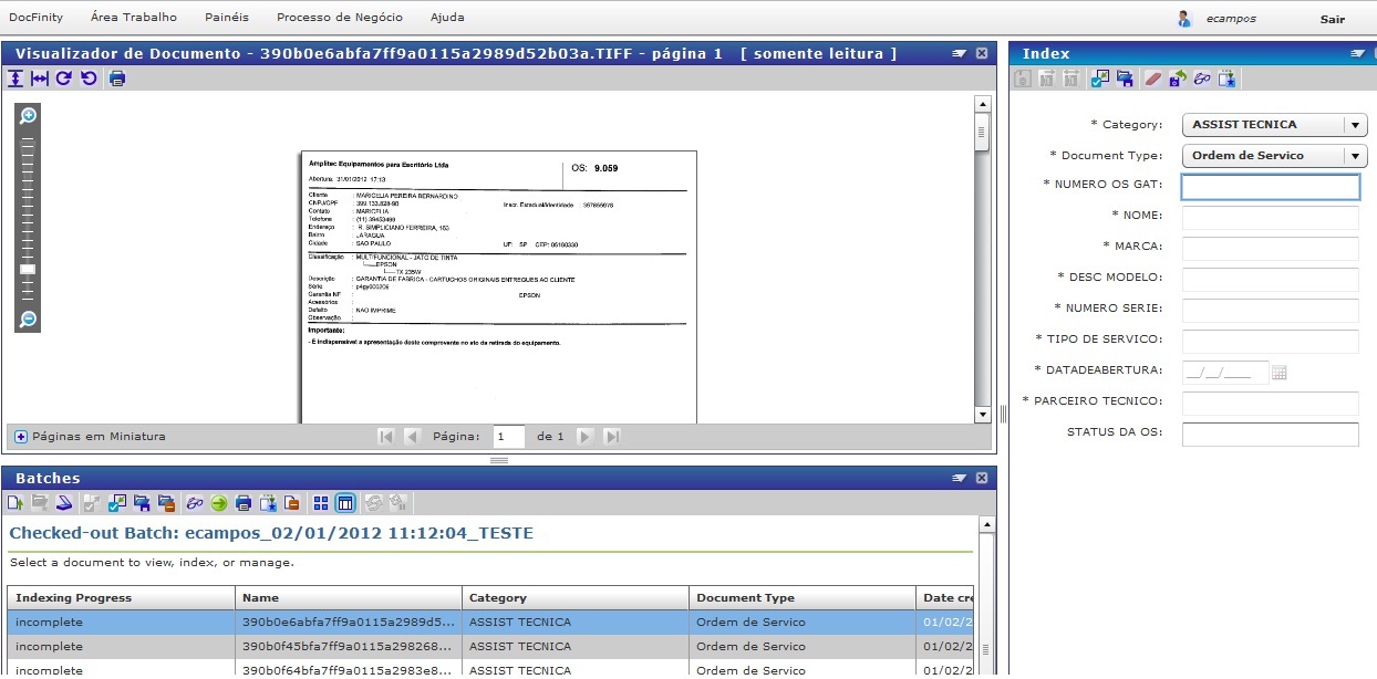 Na janela direita inferior, haverá uma listagem com todos os documentos deste lote a serem indexados.